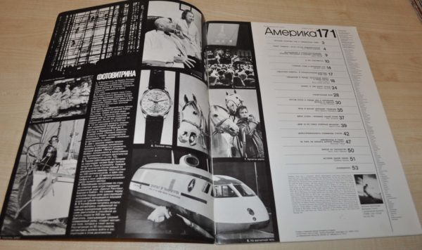 Amerika (Russian: “Америка”) was a Russian-language magazine published by the United States Department of State during the Cold War for distribution in the Soviet Union. It was intended to inform Soviet citizens about American life. Amerika was distinguished among other Soviet publications by its high-grade paper, bright printing and numerous photos. The magazine has been described as “polite propaganda” and featured high-quality photography and articles about everyday life in the United States, as well as profiles of famous American people and institutions. Later it briefly existed as America Illustrated. 454 issues in total were published.